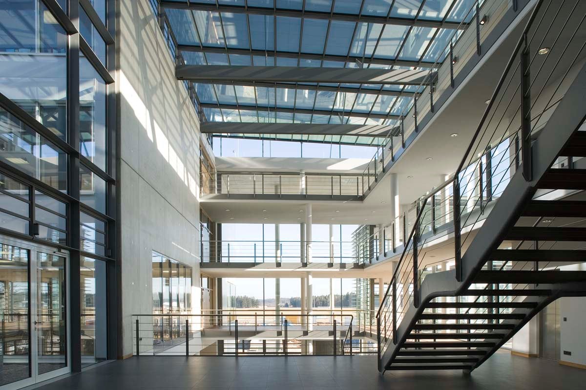 Dans nos installations de Gilching, nous offrons une atmosphère propice à l’échange, à la coopération et au développement de projets. Au centre du bâtiment se trouve notre hall d’atrium inondé de lumière, qui est un point de rencontre et un lieu d’interaction. Toutes les fonctions importantes telles que les bancs d’essai, les ateliers de formation et les salles de réunion sont situées à côté.